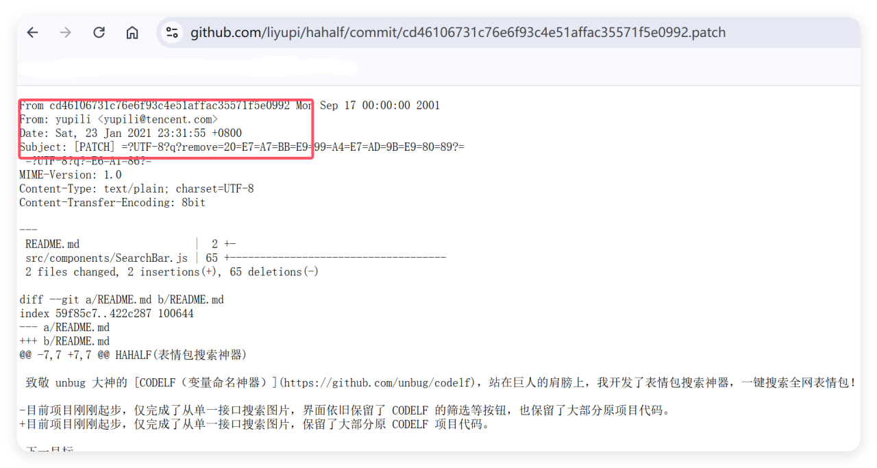 的提交历史里就暴露了他的工作邮箱,当然人家可能不在意这个隐私。