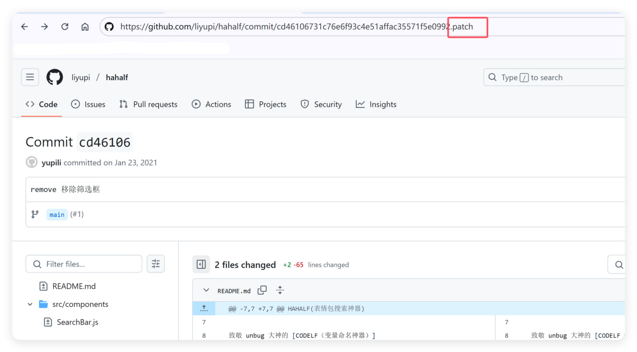 查询办法如下:在你之前的提交历史中,地址栏结尾加上.patch